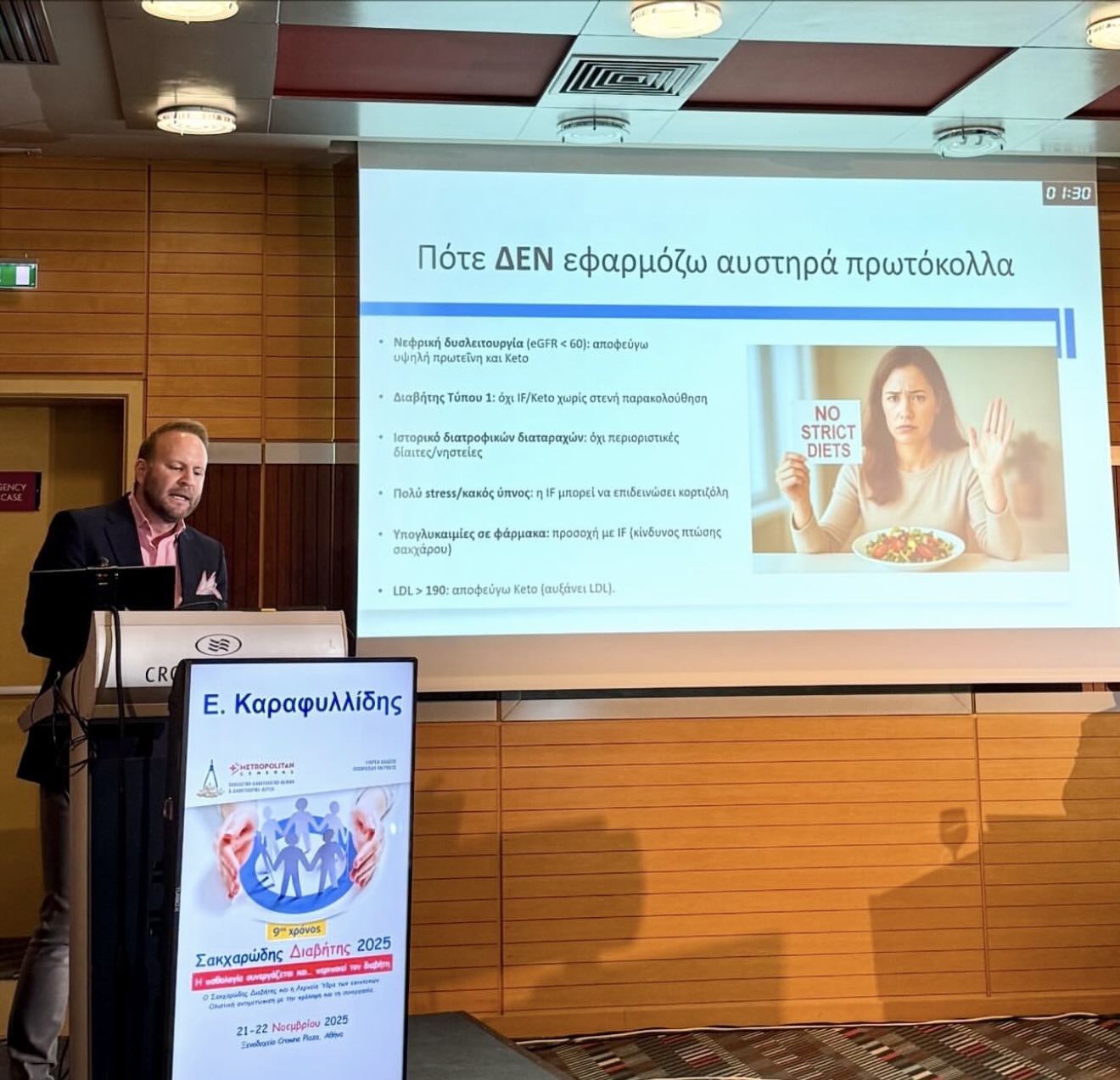 Ο κ. Ευμένης Π. Καραφυλλίδης συμμετείχε ως ομιλητής στο συνέδριο «Σακχαρώδης Διαβήτης 2025», παρουσιάζοντας το σύγχρονο διατροφικό πλαίσιο που επηρεάζει τη ρύθμιση του διαβήτη: γλυκαιμικός δείκτης, διαλειμματική νηστεία, πρωτεϊνικά και κετογονικά πρότυπα διατροφής.